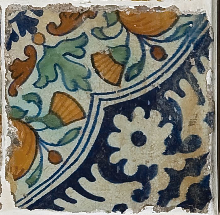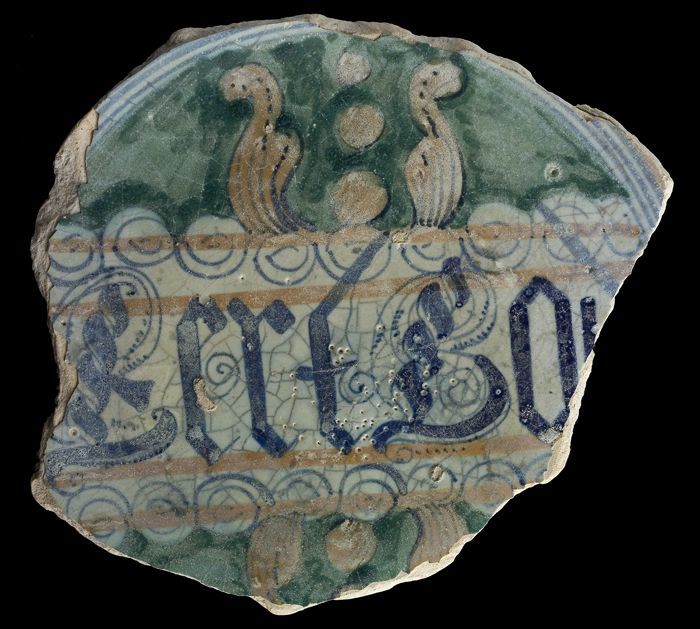 Fragment majolica bord, polychroom, tweekleurige tie...