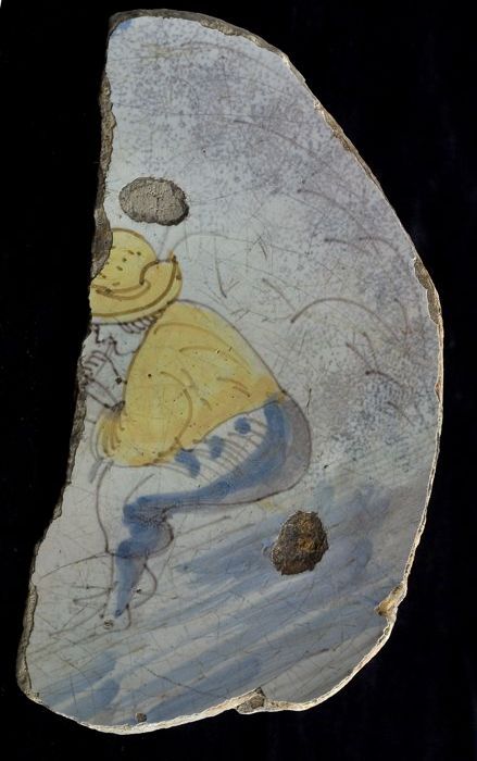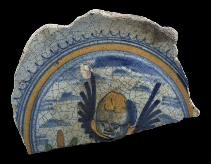 Fragment majolica schotel, polychroom, vrouw (?) met...