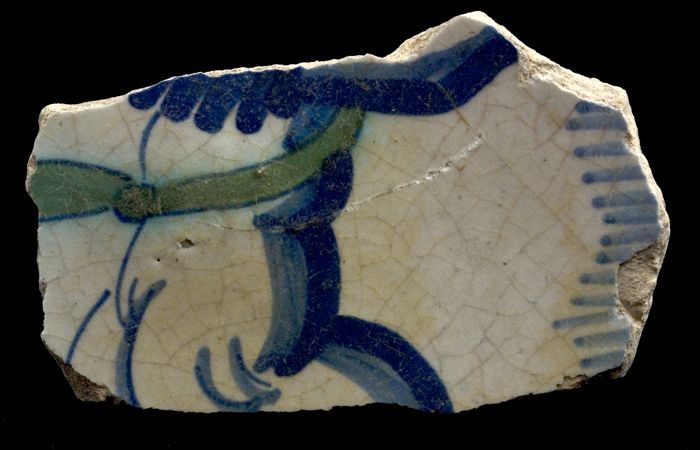 Fragment majolica schotel, groen (sjerp) en blauw op...