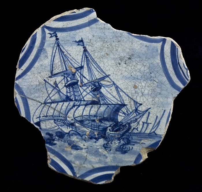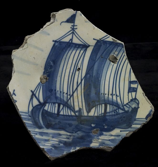 Fragment majolica schotel, blauw op wit, zeilschip, ...