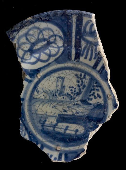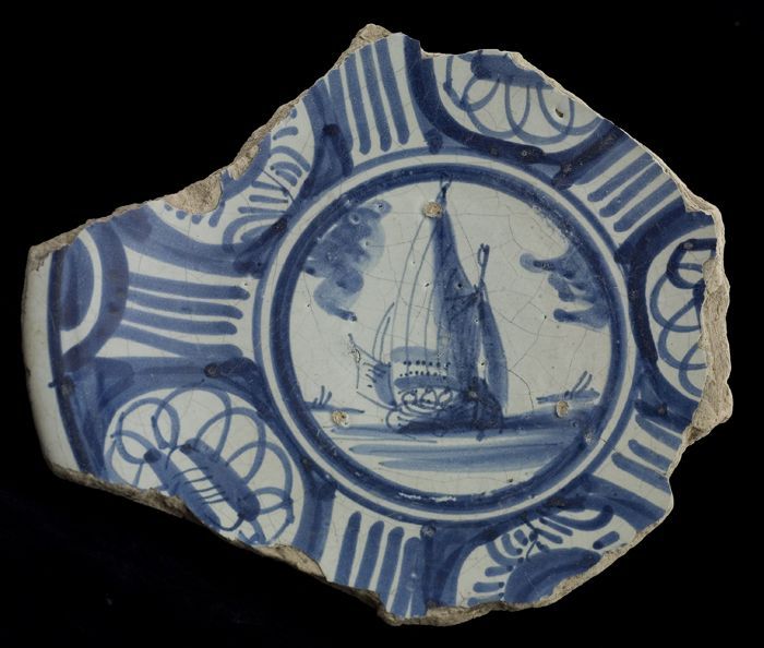 Fragment majolica schotel, blauw op wit fond, zeilsc...