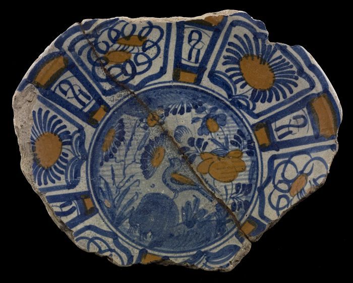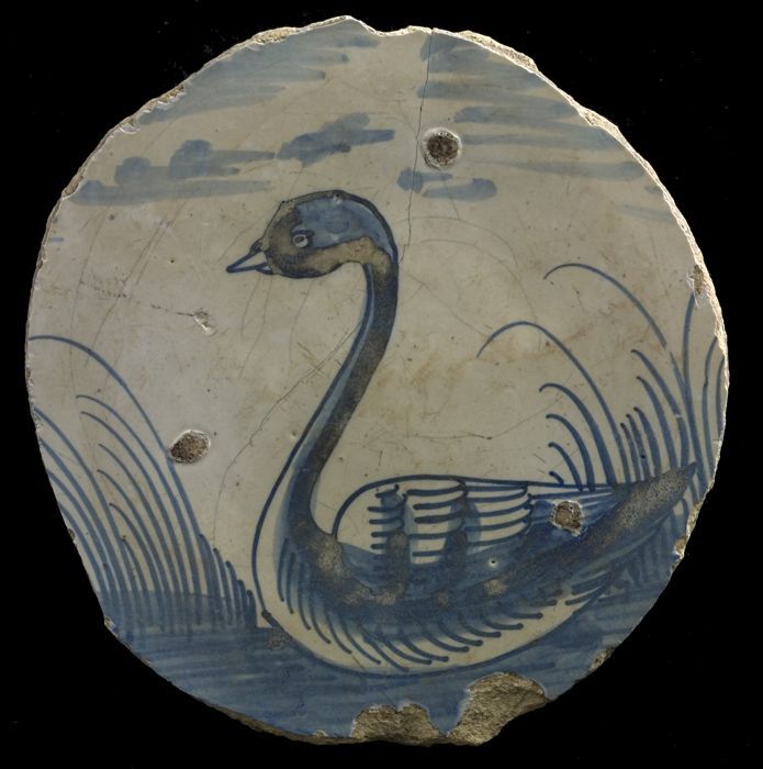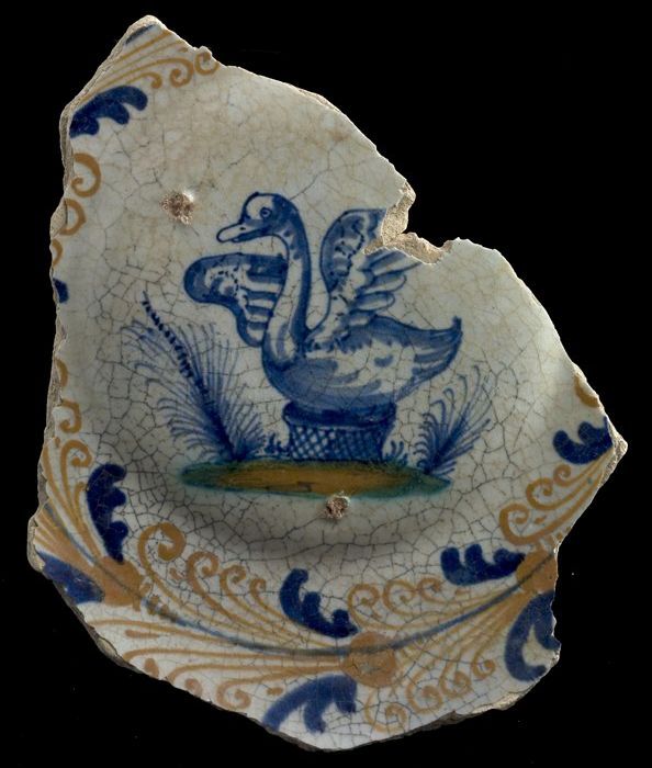 Fragment majolica schotel, polychroom, zwaan op een ...
