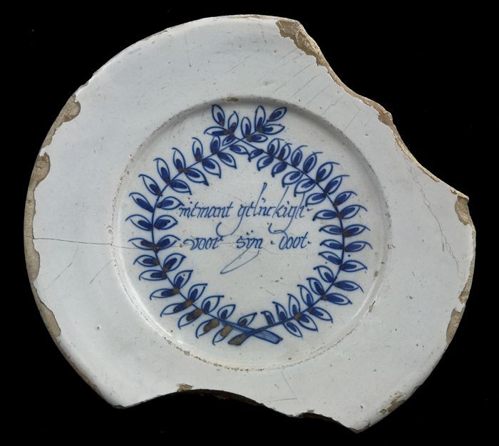 Faience bord, blauw op wit fond, spreukbord uit serie
