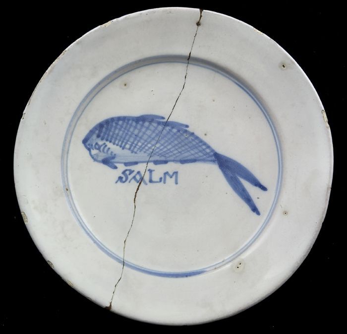 Faience bord, blauw op wit fond, vis, met onderschri...