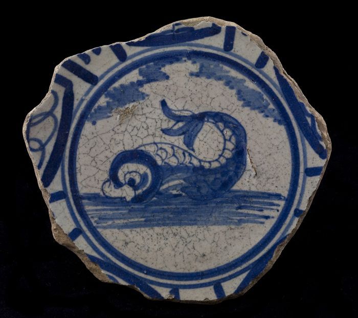 Fragment majolica schotel, blauw op wit, zwemmende z...