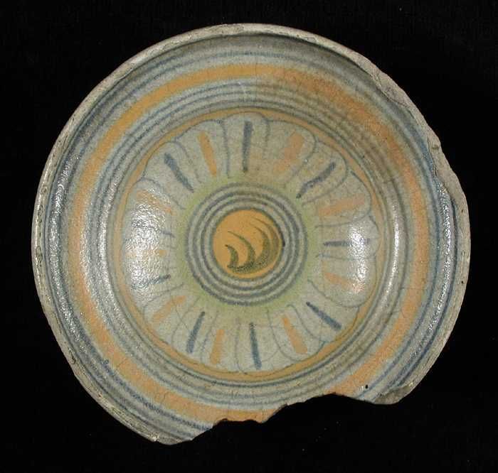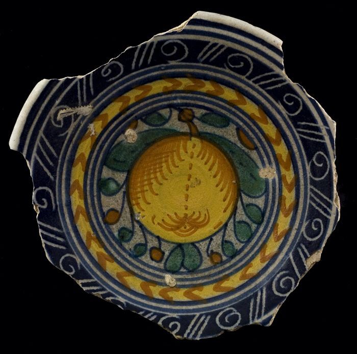 Fragment majolica schotel, polychroom, rozet in het ...