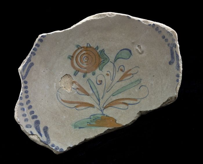 Fragment majolica schotel, polychroom, bloem met kno...