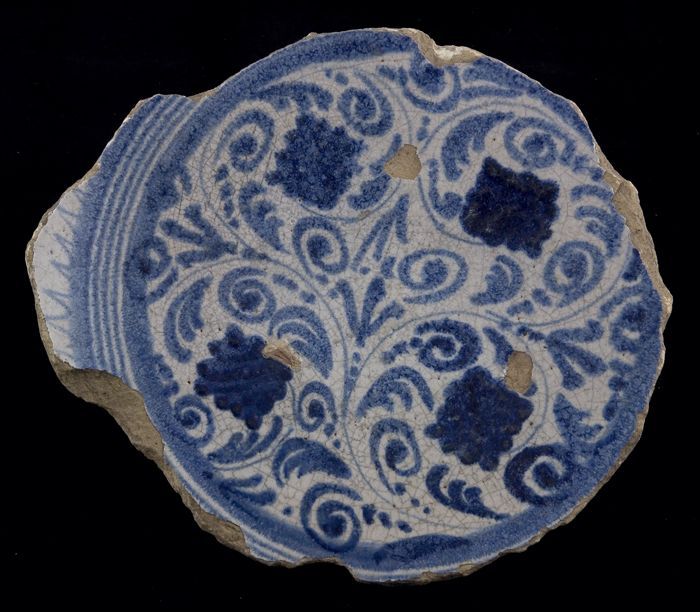 Fragment faience bord, blauw op wit, bladrankendecor...