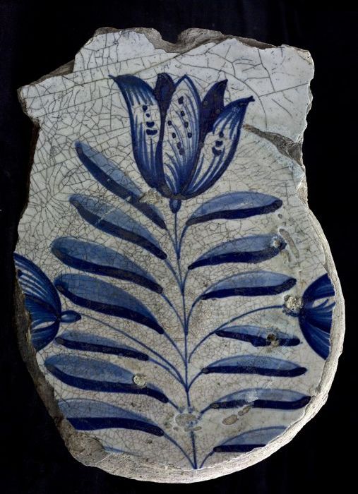 Fragment majolica schotel, blauw op wit, drietulp, tulp