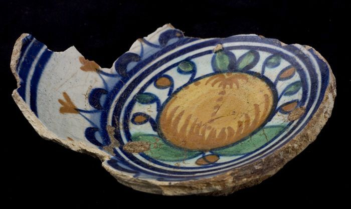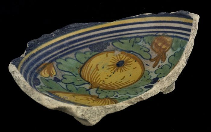 Fragment majolica kom, polychroom, decor van granaat...