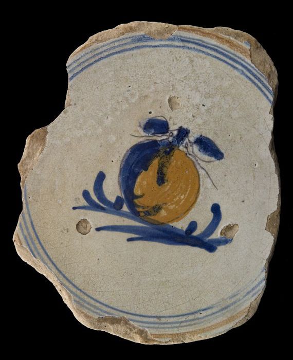 Fragment majolica schotel, oranje en blauw op wit, r...