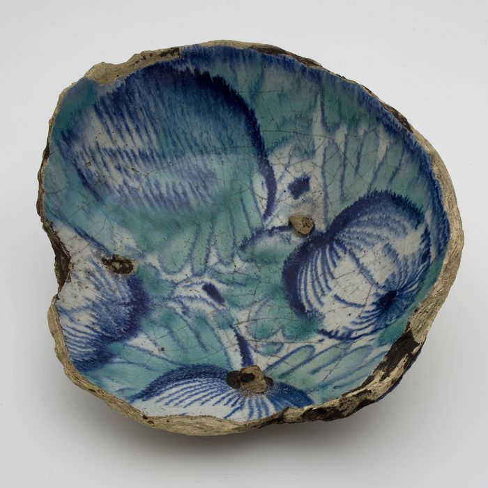 Fragment majolica kom, groen en blauw op wit, decor ...