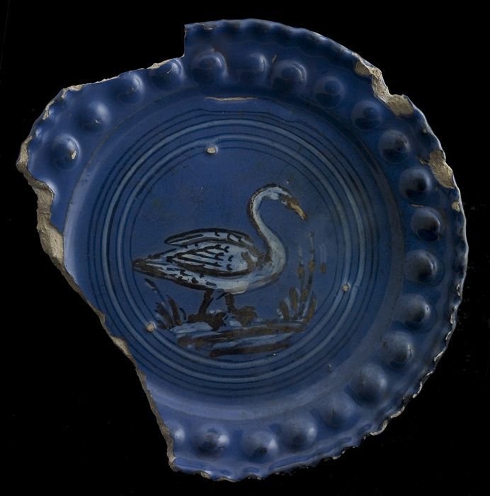 Fragment majolica schotel, blauw op wit, met gestape...