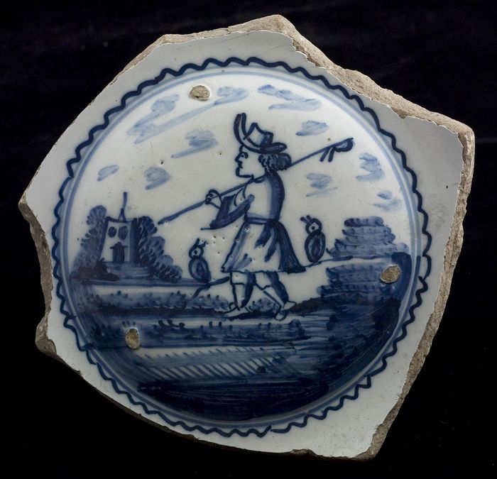 Fragment faience schotel, blauw op wit, één staande ...