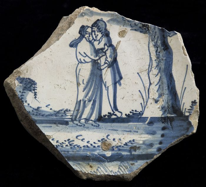 Fragment majolica schotel, blauw op wit, met een fru...