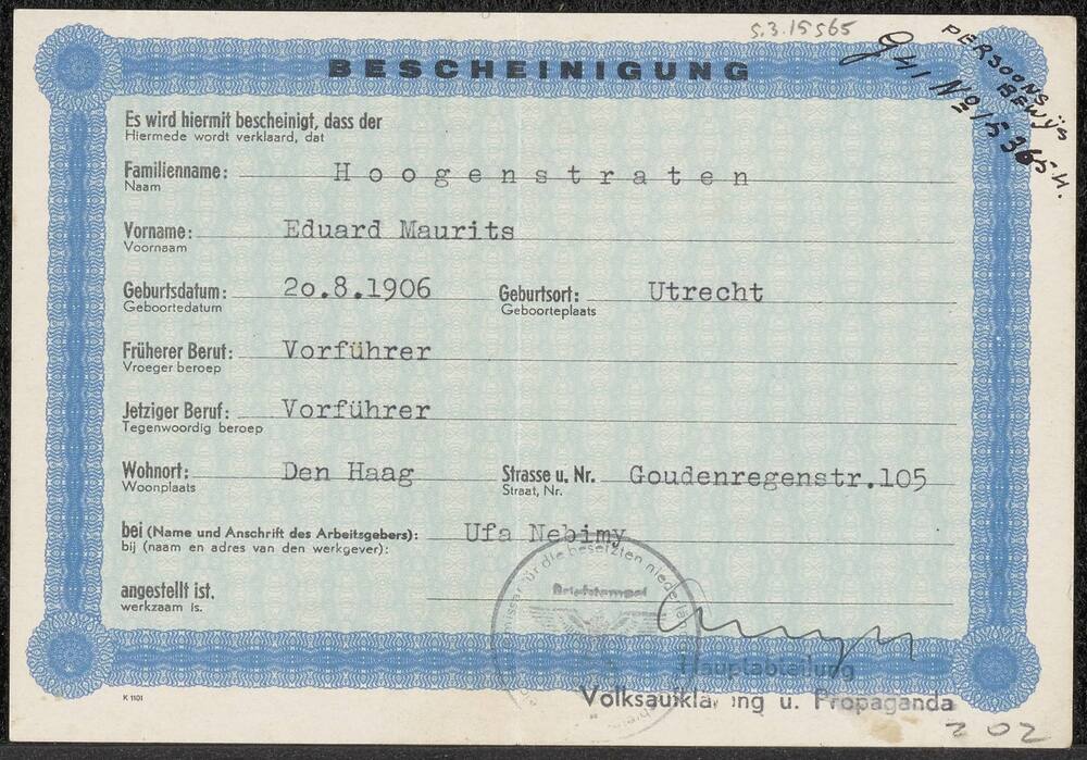 Bescheinigung op naam van E.M. Hoogenstraten, Vorfüh...