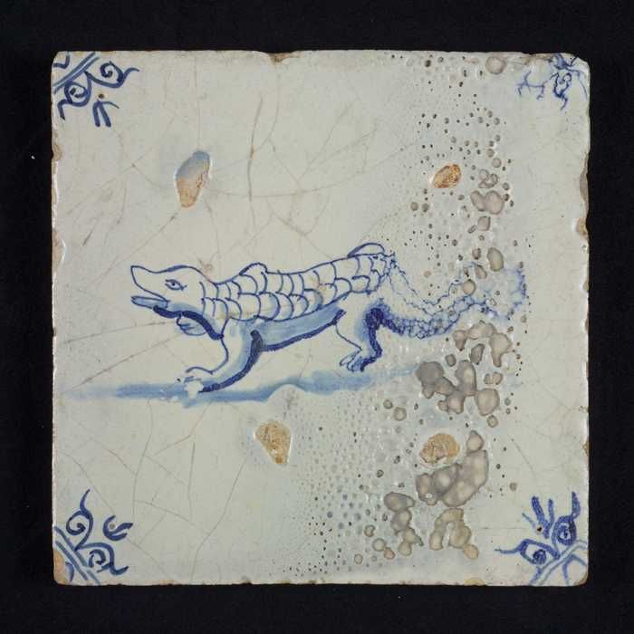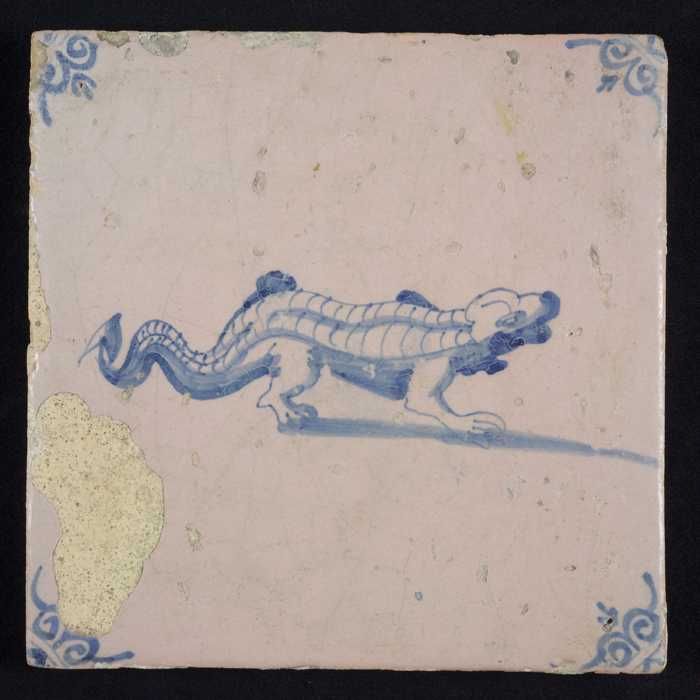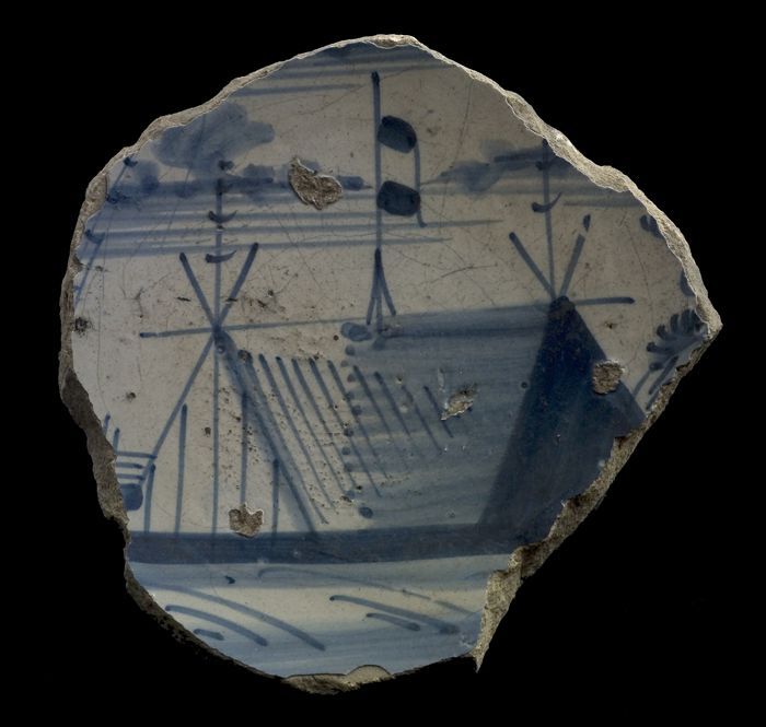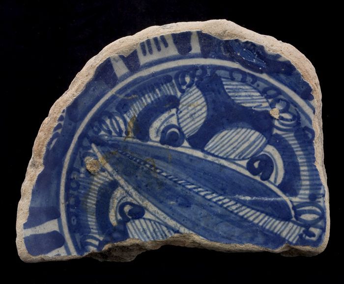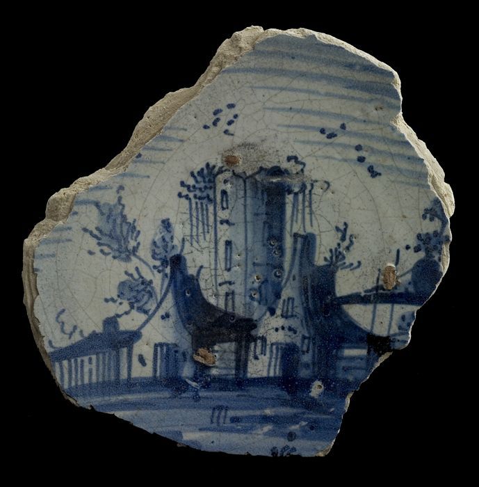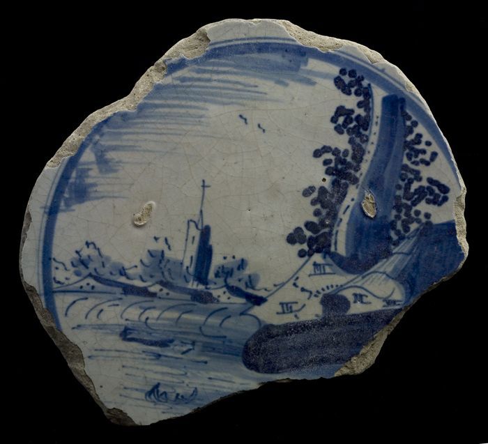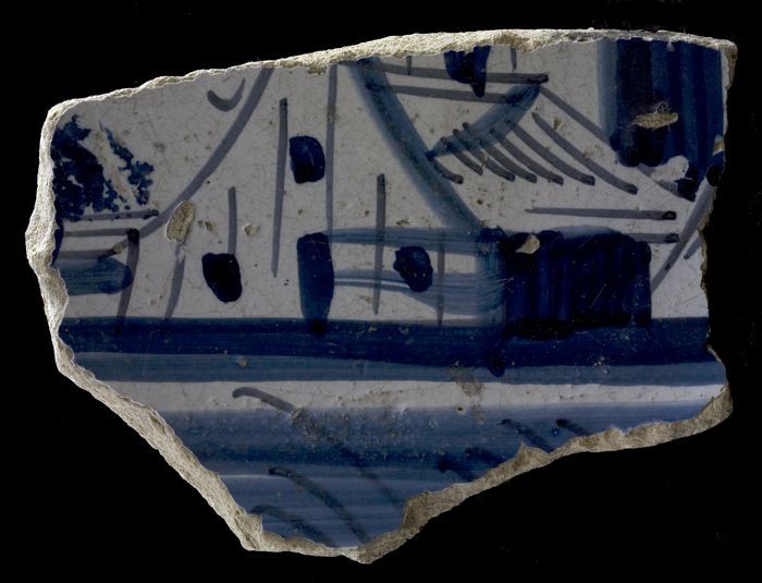 Fragment majolica schotel, blauw op wit, op de spieg...