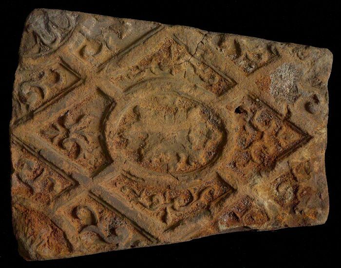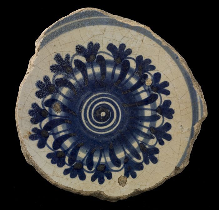 Fragment majolica (?) bord, blauw op wit, bloemrozet...