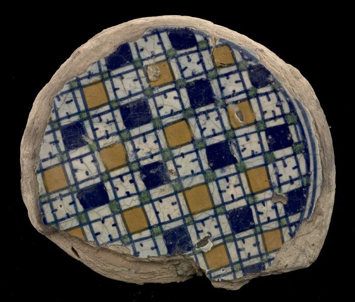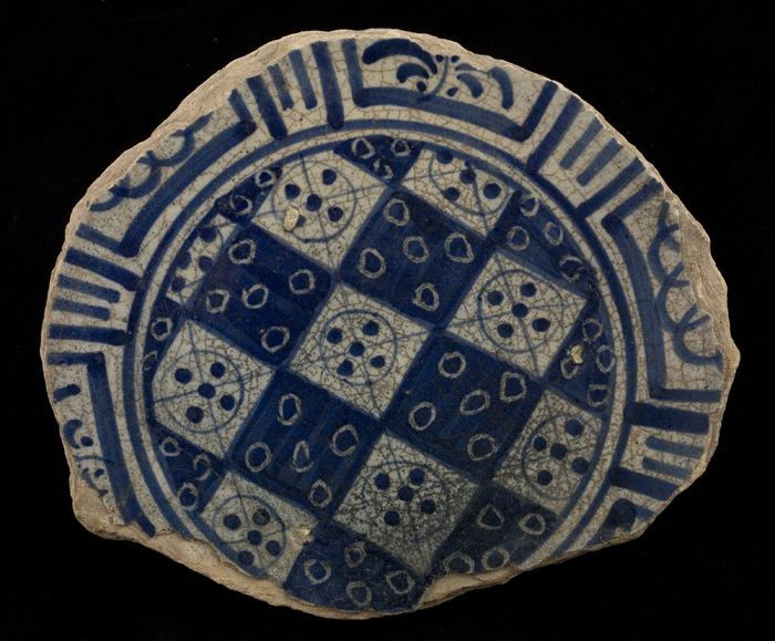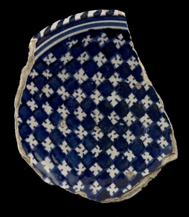 Fragment majolica bord, blauw op wit, schaakbord-decor
