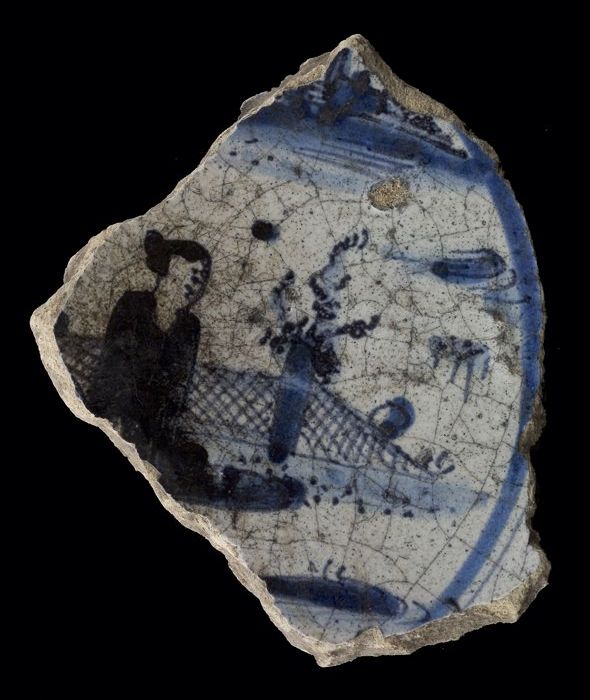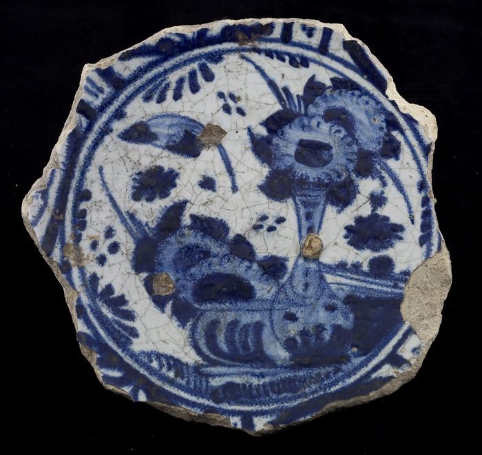 Fragment majolica bord, blauw op wit, Chinees motief...