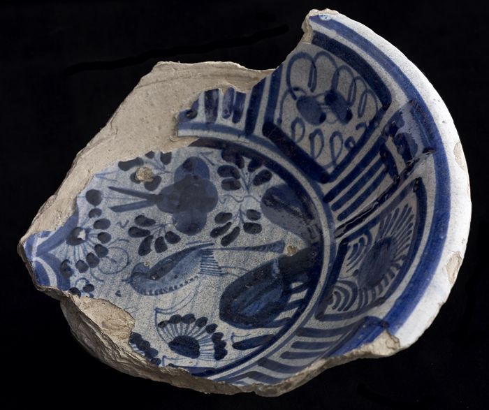 Fragment majolica bord, blauw op wit, vogel in Chine...