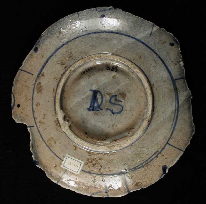Fragment majolica bord, blauw op wit, met pluimmotie...