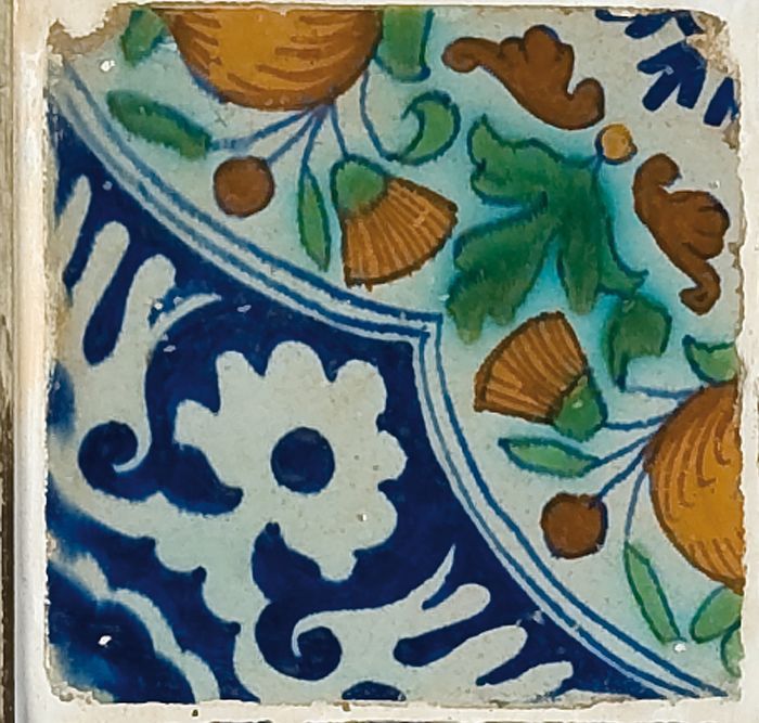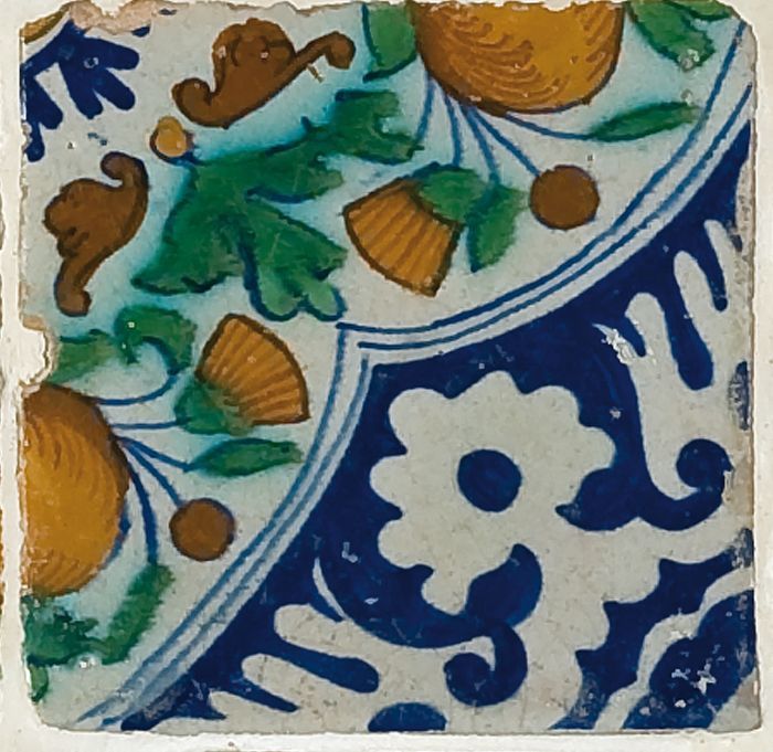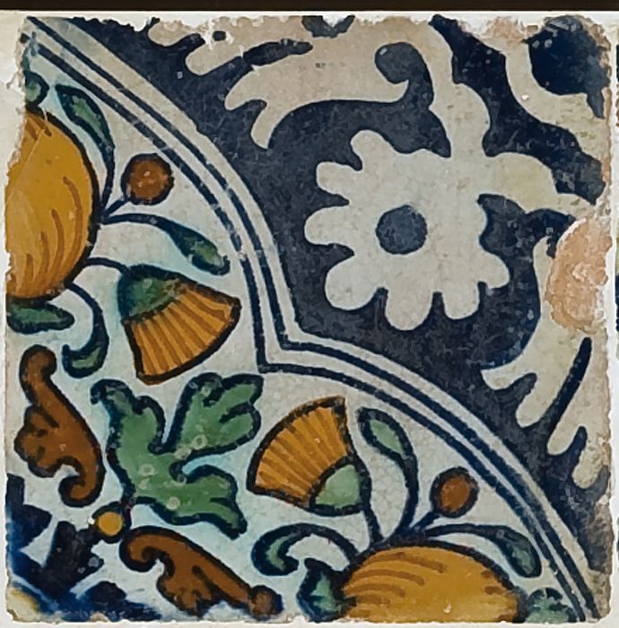 Ornamenttegel, blauw, geel en oranje op wit, diagona...