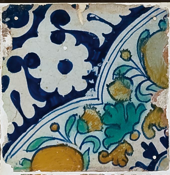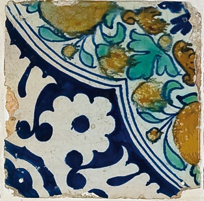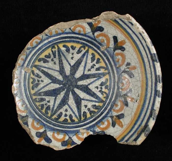 Fragment majolica kom of bord, polychroom, achtpunti...