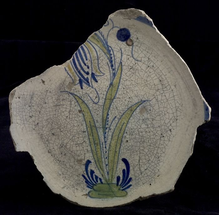 Fragment majolica bord, blauw op wit, met bloemenvaa...
