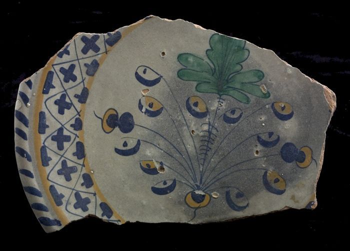 Fragment majolica schotel, polychroom, vierbladig bl...