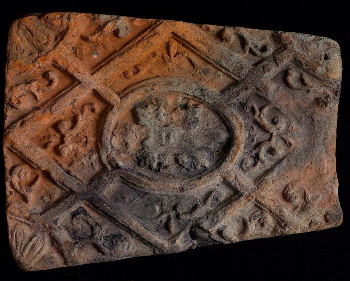 Fragment majolica schotel, blauw op wit, met heraldi...