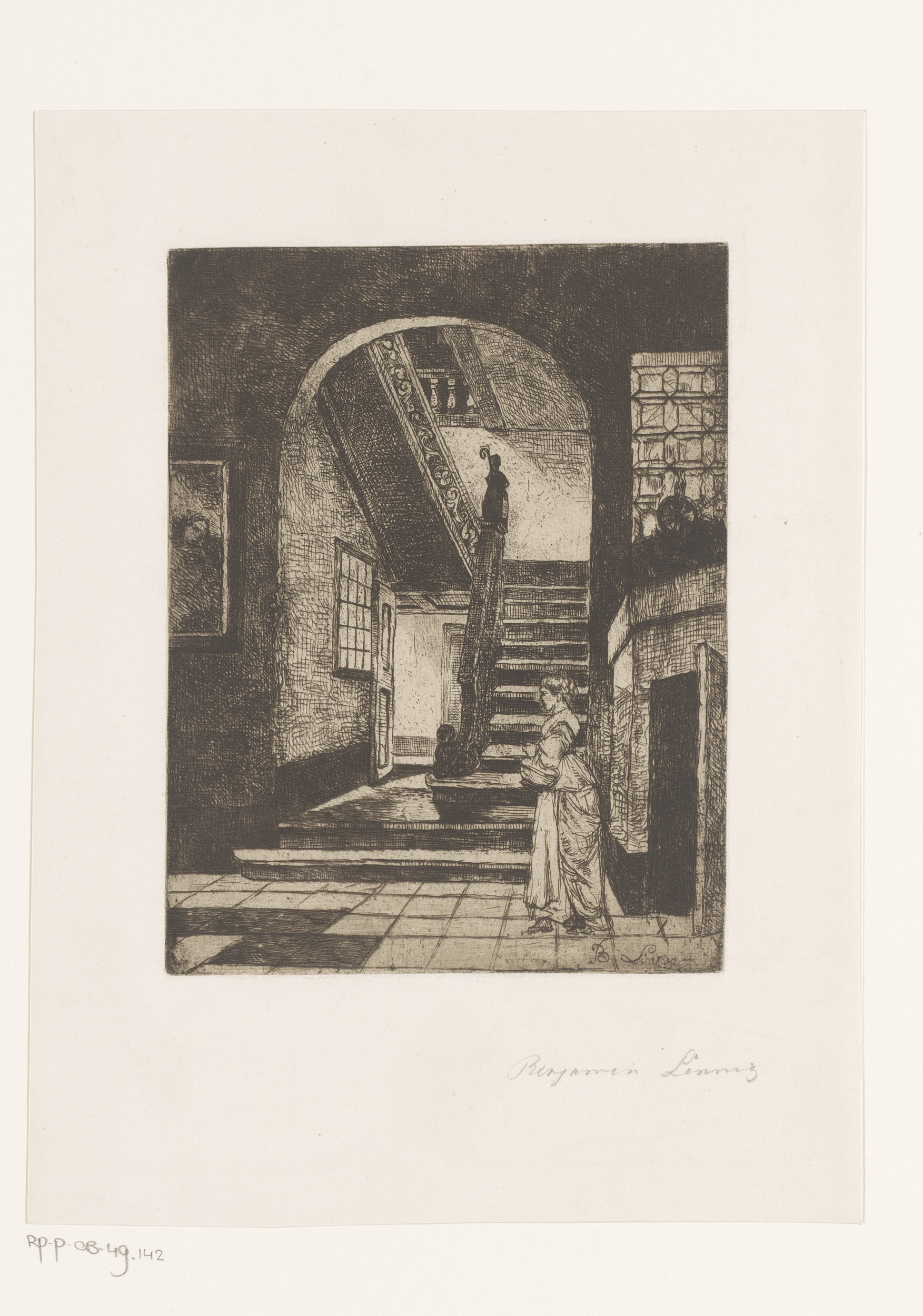 Trappenhuis, op de voorgrond een vrouw met mand aan ...