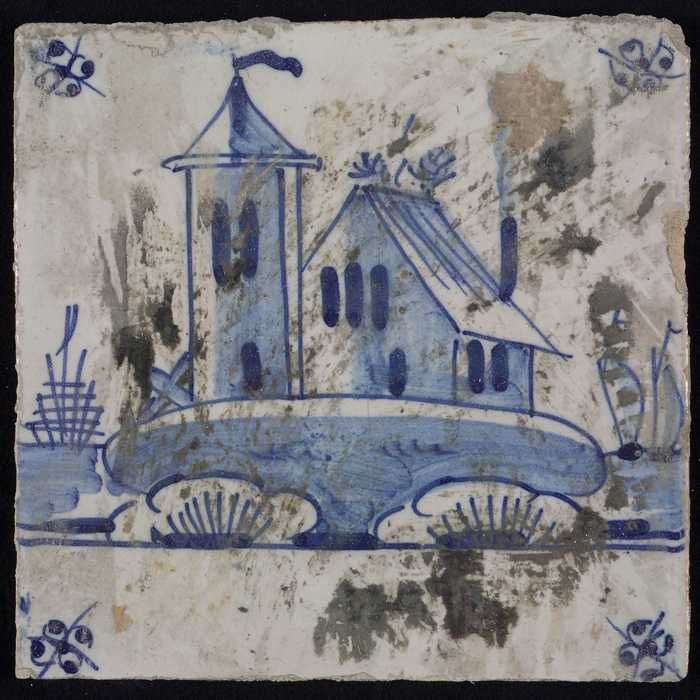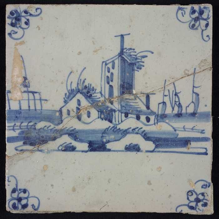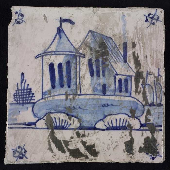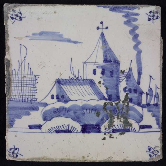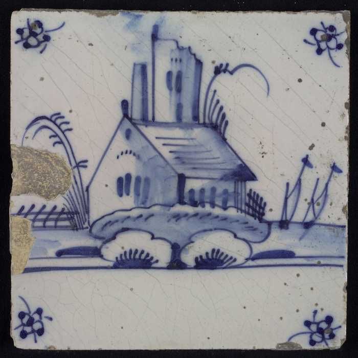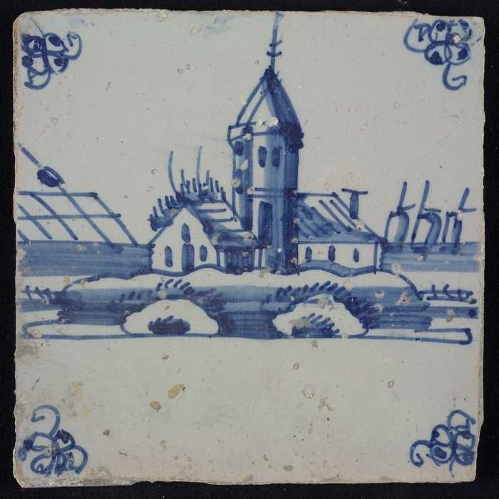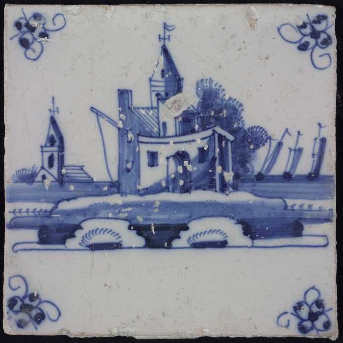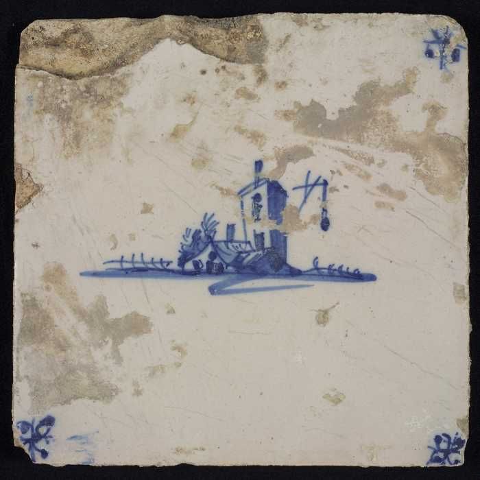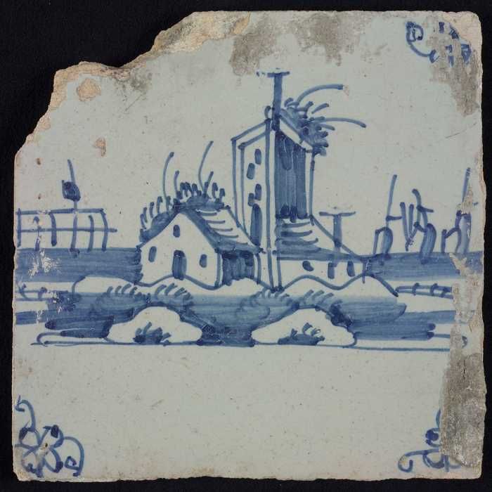 Tafereeltegel, blauw, huisje en een toren, hoekmotie...