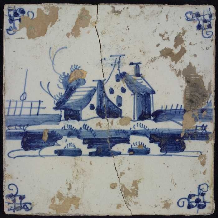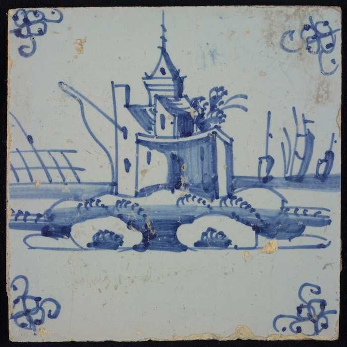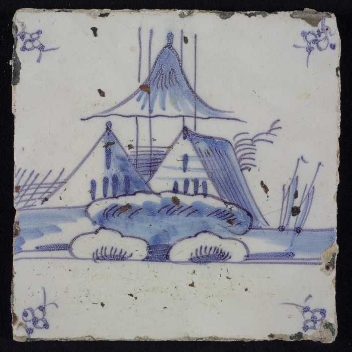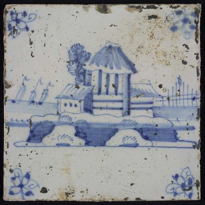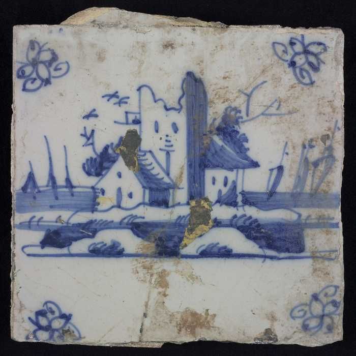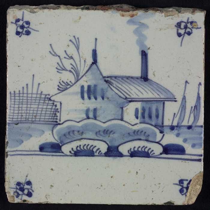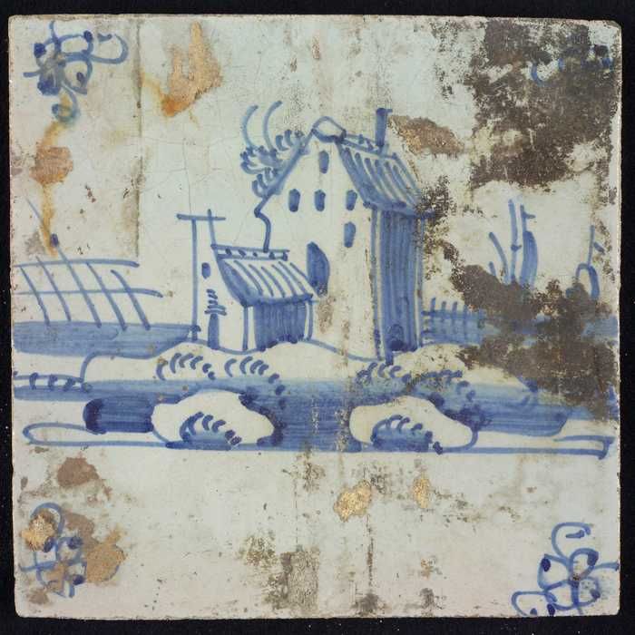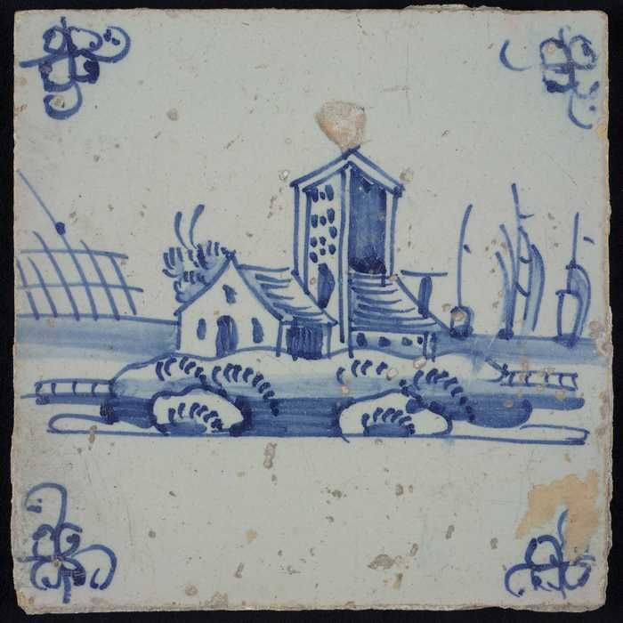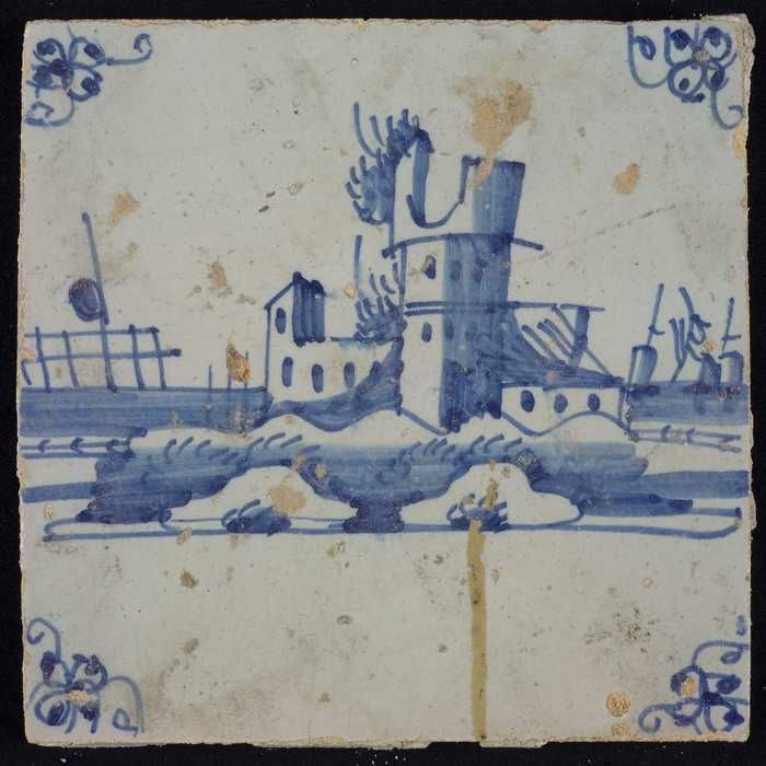 Tafereeltegel, blauw, huisje en een toren, hoekmotie...
