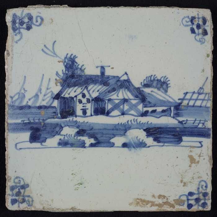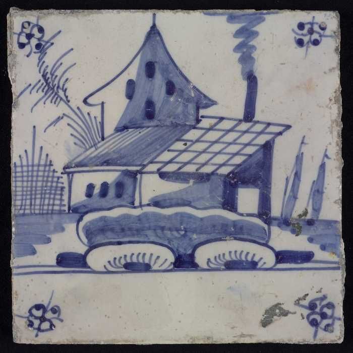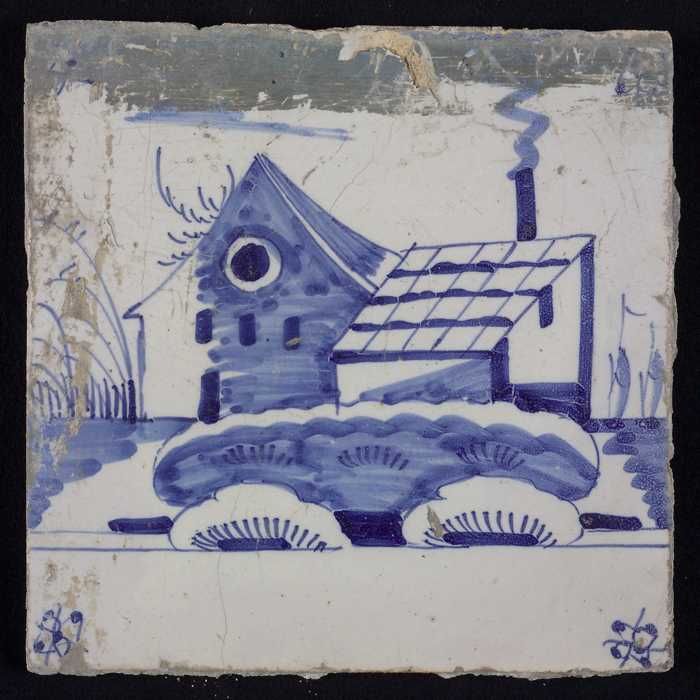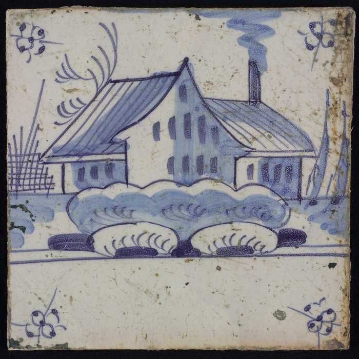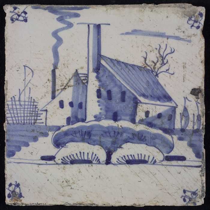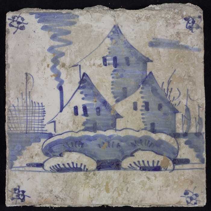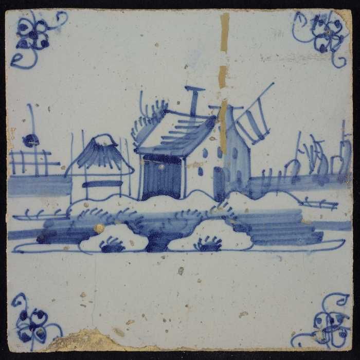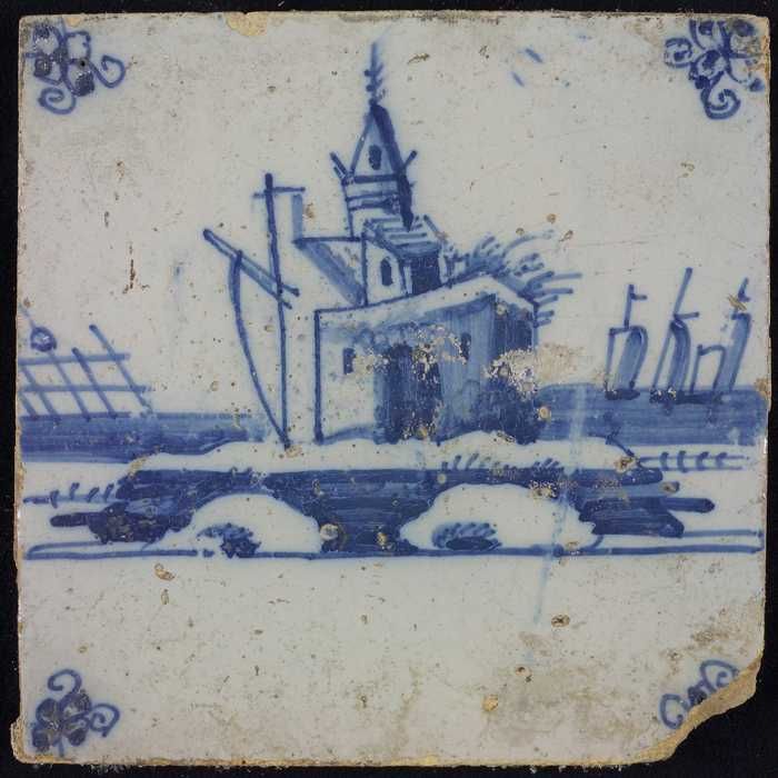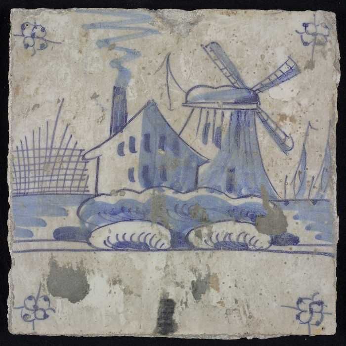 Tafereeltegel, blauw, huis en een molen, hoekmotief ...