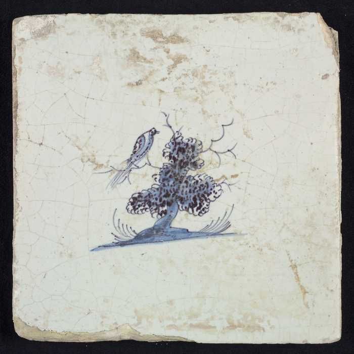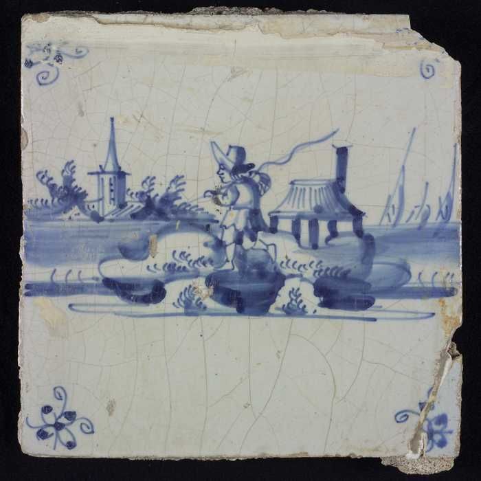 Tafereeltegel, blauw, toren met vuurbaken, hoekmotie...