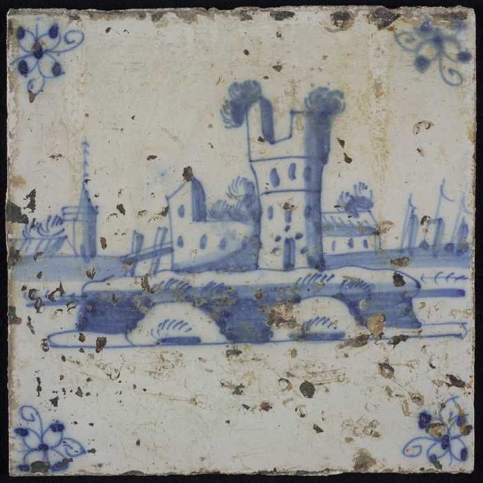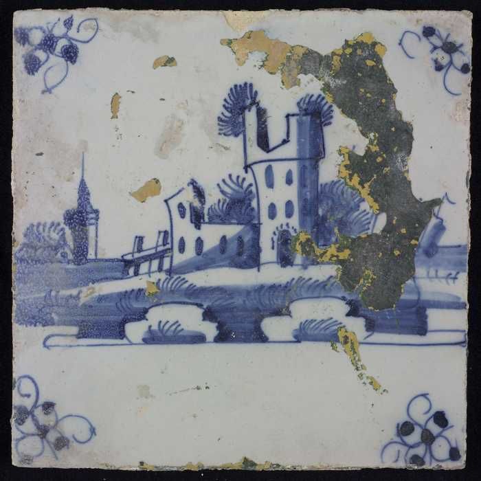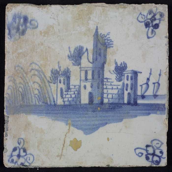 Tafereeltegel, blauw, gebouwen met ruïne, hoekmotief...