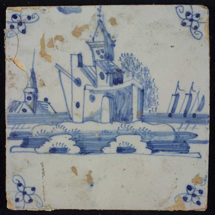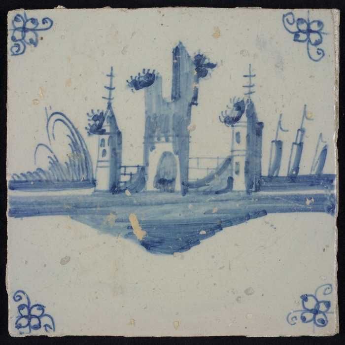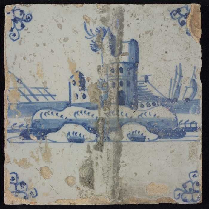 Tafereeltegel, blauw, toren met scheepjes, hoekmotie...