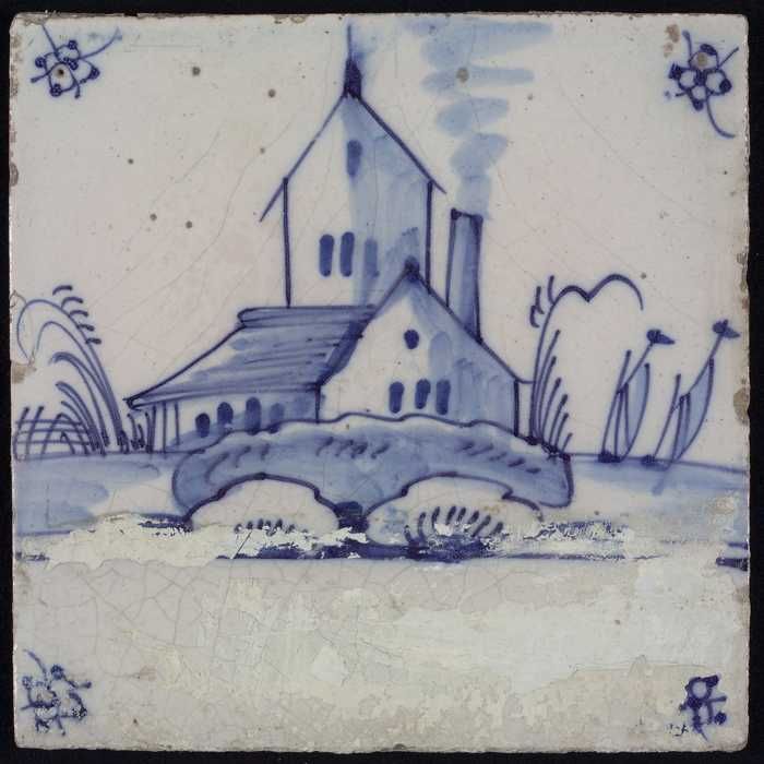 Tafereeltegel, blauw, kerk met hoge spitse toren, ho...