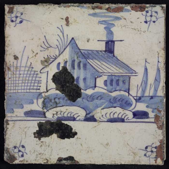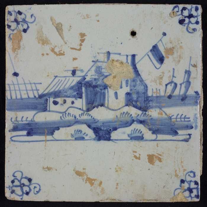 Tafereeltegel, blauw, huisje met vlag en scheepjes, ...