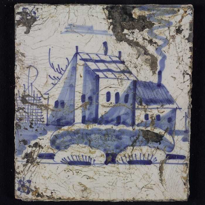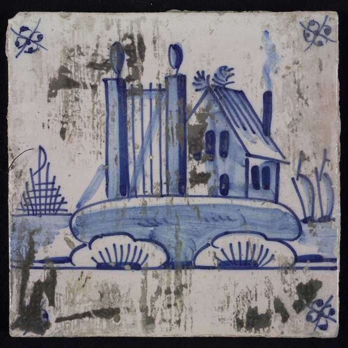 Tafereeltegel, blauw, huis met een groot hek met zui...