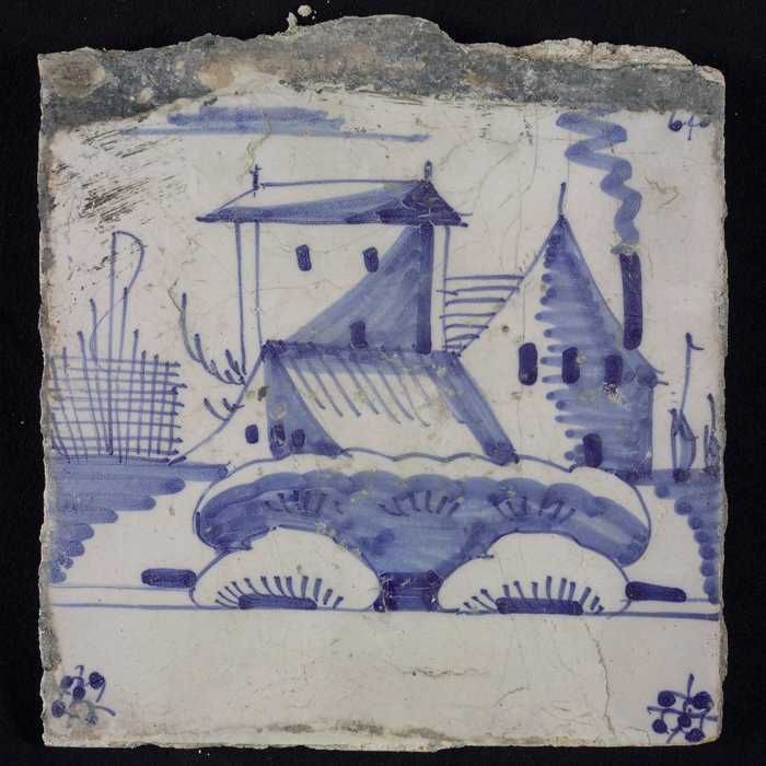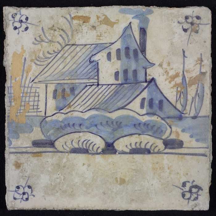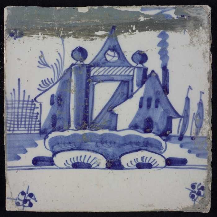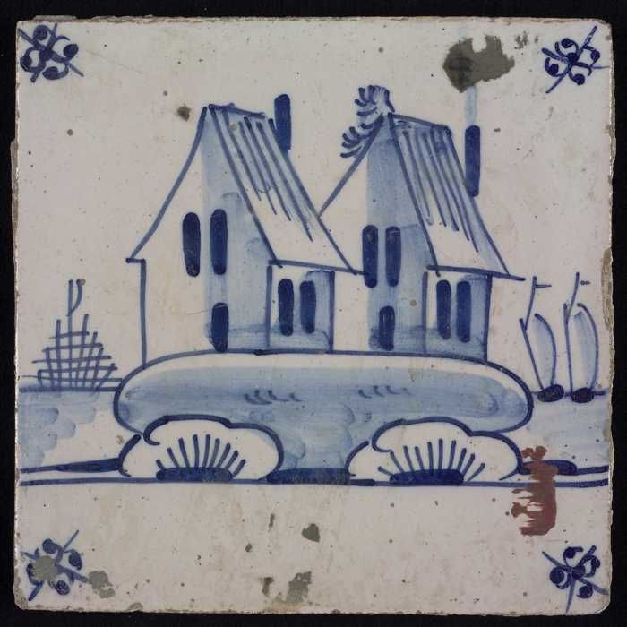 Tafereeltegel, blauw, huis en een toren, hoekmotief ...