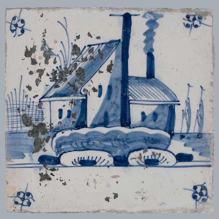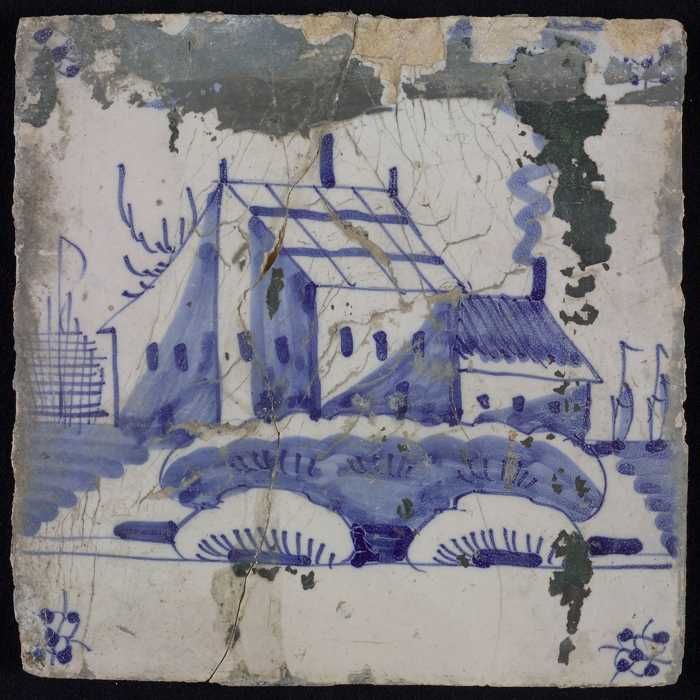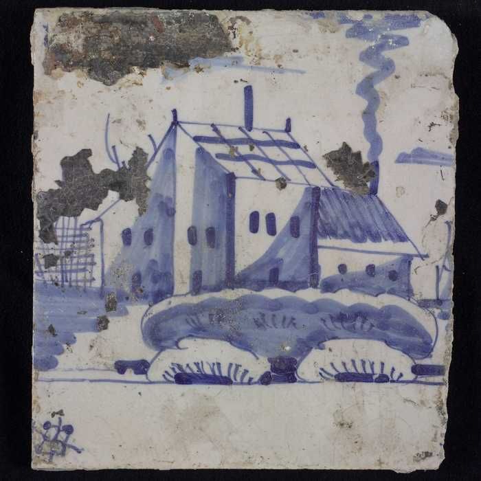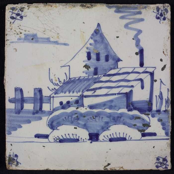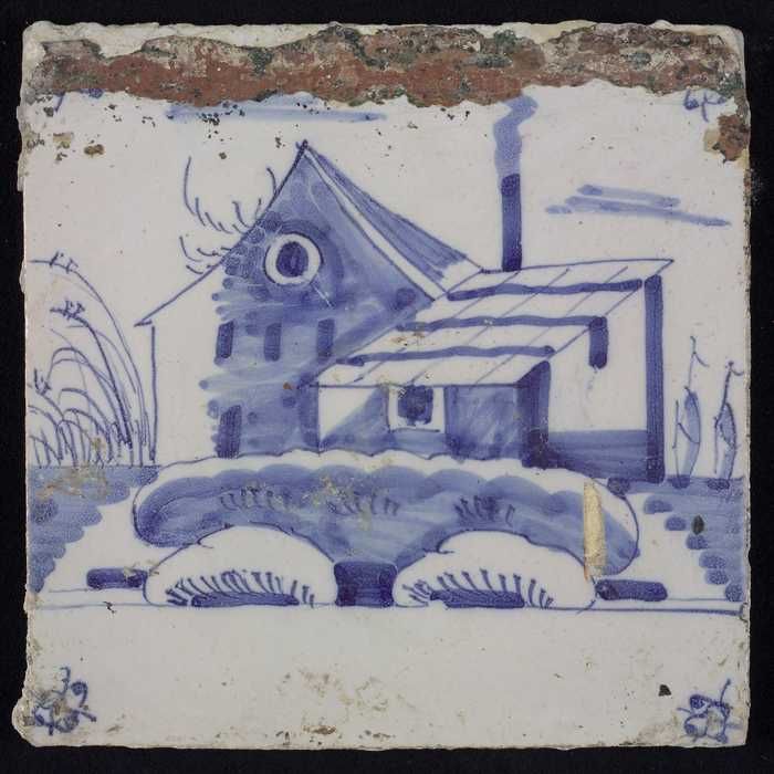 Tafereeltegel, blauw, huis met schuur met schoorstee...