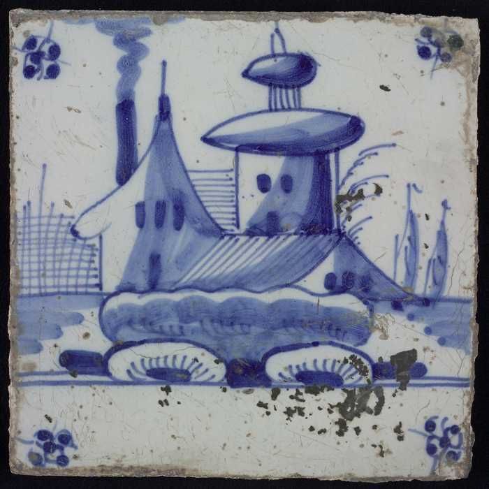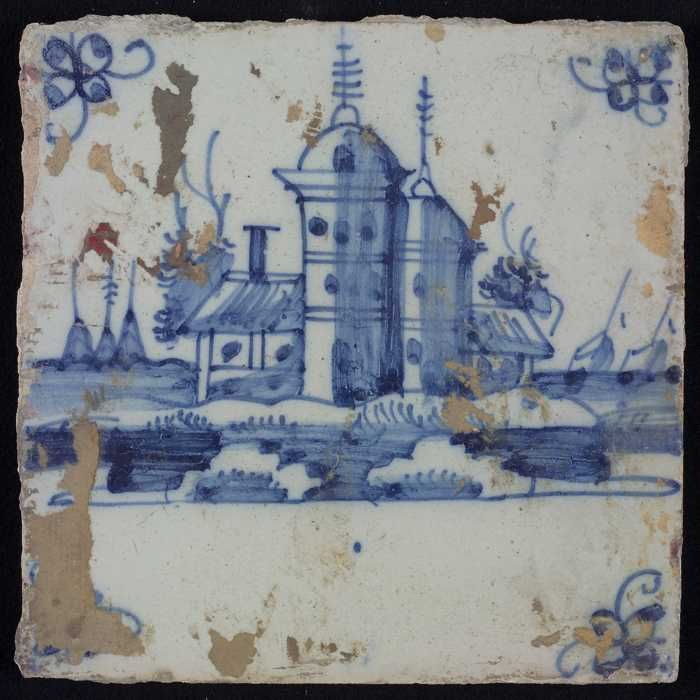 Tafereeltegel, blauw, gebouw met torentje, hoekmotie...