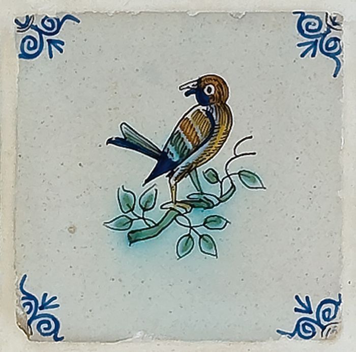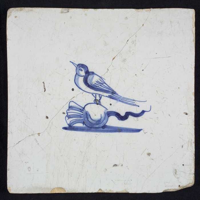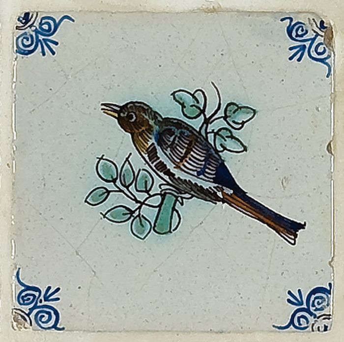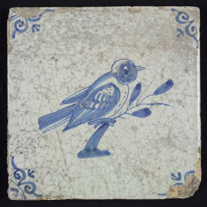 Dierentegel, vogel op tak, hoekmotief ossenkop