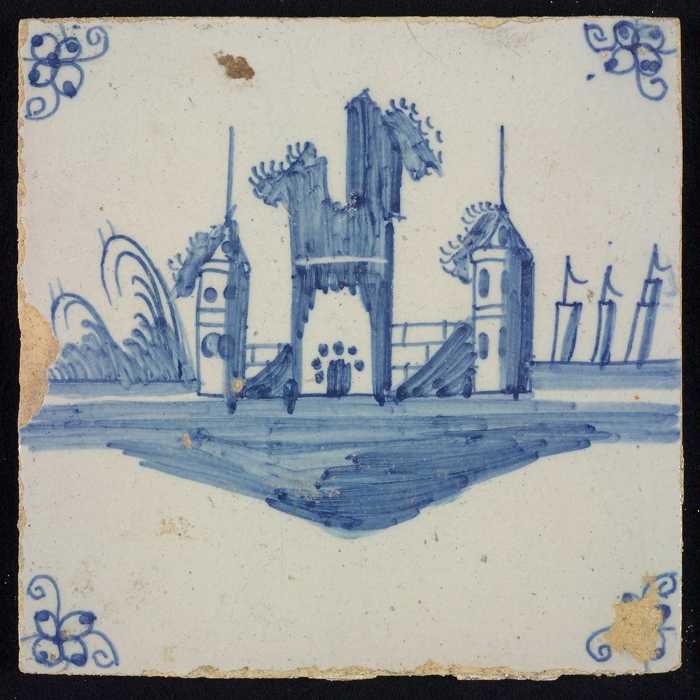 Tafereeltegel, blauw, een kasteelruïne, hoekmotief spin