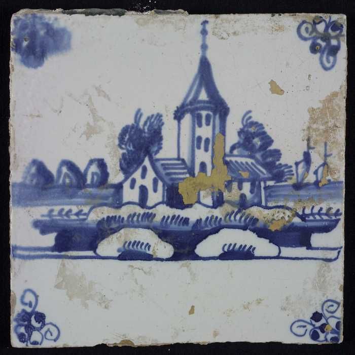 Tafereeltegel, blauw, kerk met spitse toren, hoekmot...