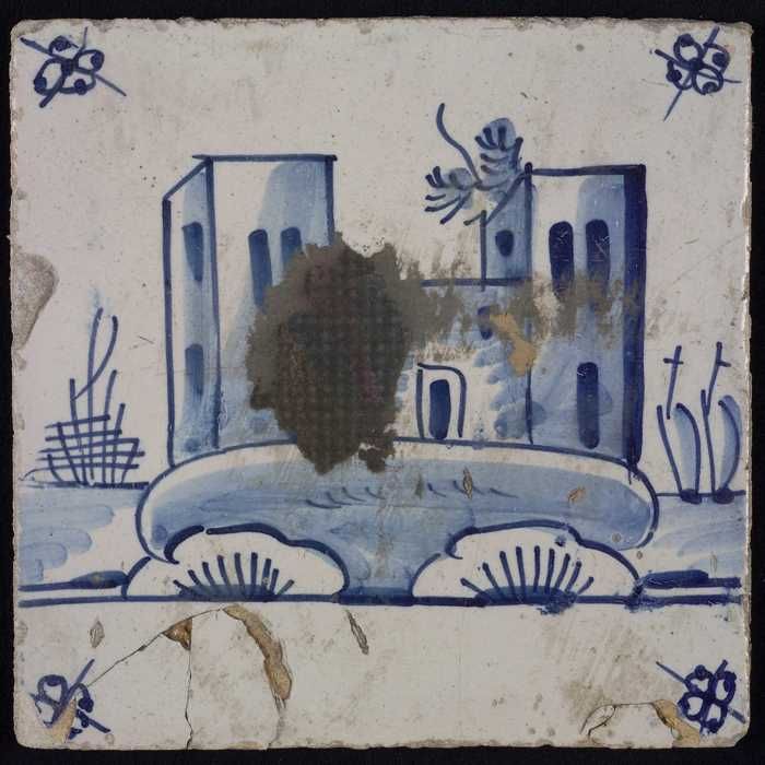 Tafereeltegel, blauw, huis en ruïne-toren, hoekmotie...