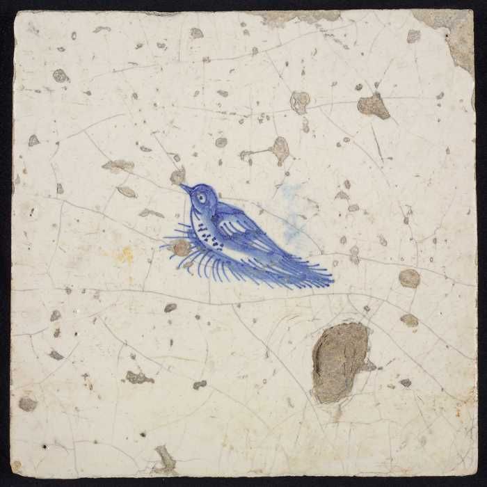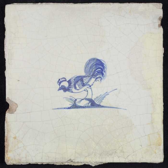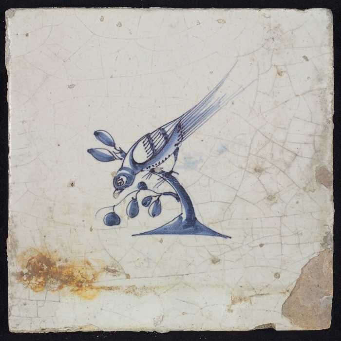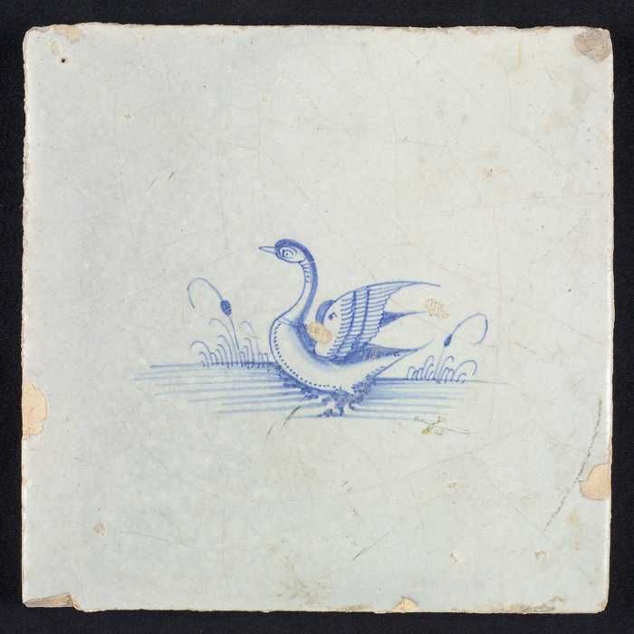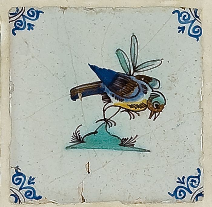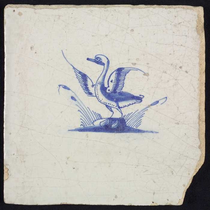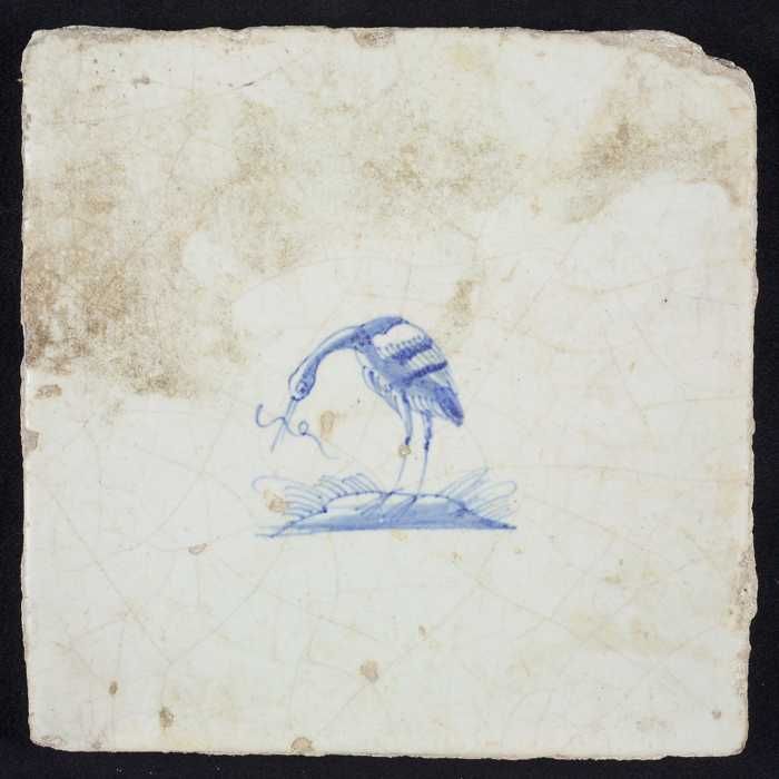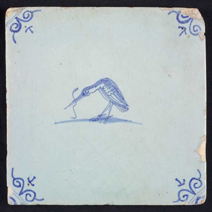 Dierentegel, vogel met vis, hoekmotief ossenkop