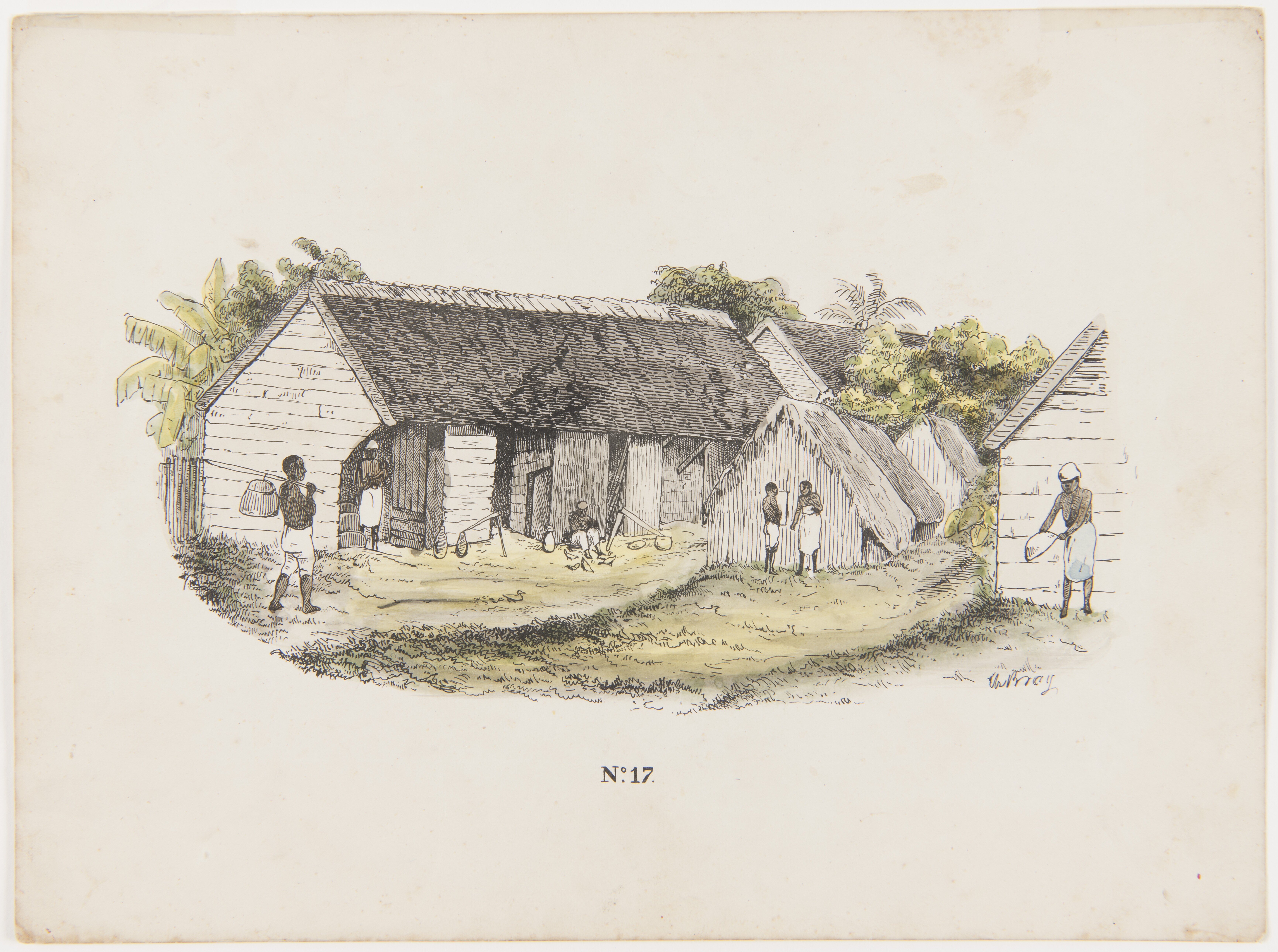 Lithografie van een tot slaaf gemaakte familie op ee...